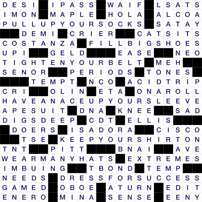 The Puzzle Grid for Today is 21 boxes wide and 21 boxes tall. It’s name is Fit for the Job. The todays puzzle is classified as an American type of puzzle and was created by Alexander Liebeskind & Edited by Mike Shenk. It has a total of 63 Horizontal Clues and 77 Vertical clues, which need to be solved to completely solve the puzzle.