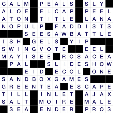 The Puzzle Grid for Today is 15 boxes wide and 15 boxes tall. It’s name is Child’s Play. The todays puzzle is classified as an American type of puzzle and was created By Hal Moore & Edited by Mike Shenk. It has a total of 36 Horizontal Clues and 38 Vertical clues, which need to be solved to completely solve the puzzle.