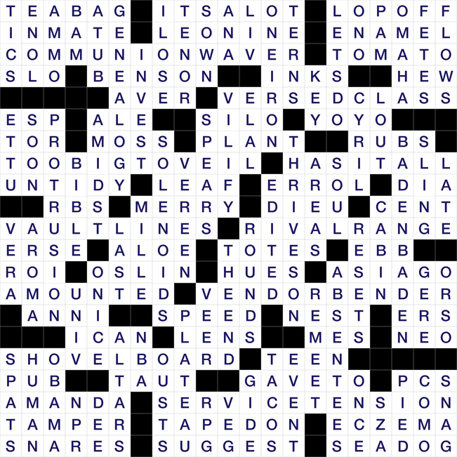 The Puzzle Grid for Today is 21 boxes wide and 21 boxes tall. It’s name is Vinyl Exam. The todays puzzle is classified as an American type of puzzle and was created by Mike Shenk & Edited by Mike Shenk. It has a total of 66 Horizontal Clues and 74 Vertical clues, which need to be solved to completely solve the puzzle.