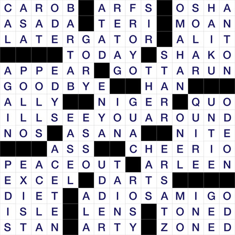 The Puzzle Grid for Today is 15 boxes wide and 15 boxes tall. It’s name is Parting Shots. The todays puzzle is classified as an American type of puzzle and was created By Andrea Carla Michaels & Kevin Christian & Edited by Mike Shenk. It has a total of 35 Horizontal Clues and 43 Vertical clues, which need to be solved to completely solve the puzzle.