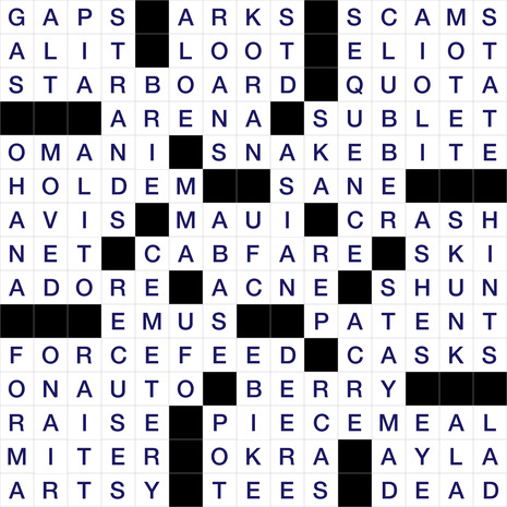 The Puzzle Grid for Today is 15 boxes wide and 15 boxes tall. It’s name is Fowl Play. The todays puzzle is classified as an American type of puzzle and was created By Aaron Ullman & Edited by Mike Shenk. It has a total of 35 Horizontal Clues and 41 Vertical clues, which need to be solved to completely solve the puzzle.