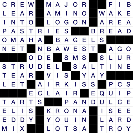 The Puzzle Grid for Today is 15 boxes wide and 15 boxes tall. It’s name is Assorted Baked Goods. The todays puzzle is classified as an American type of puzzle and was created By Ron Ammirante & Edited by Mike Shenk. It has a total of 40 Horizontal Clues and 42 Vertical clues, which need to be solved to completely solve the puzzle.