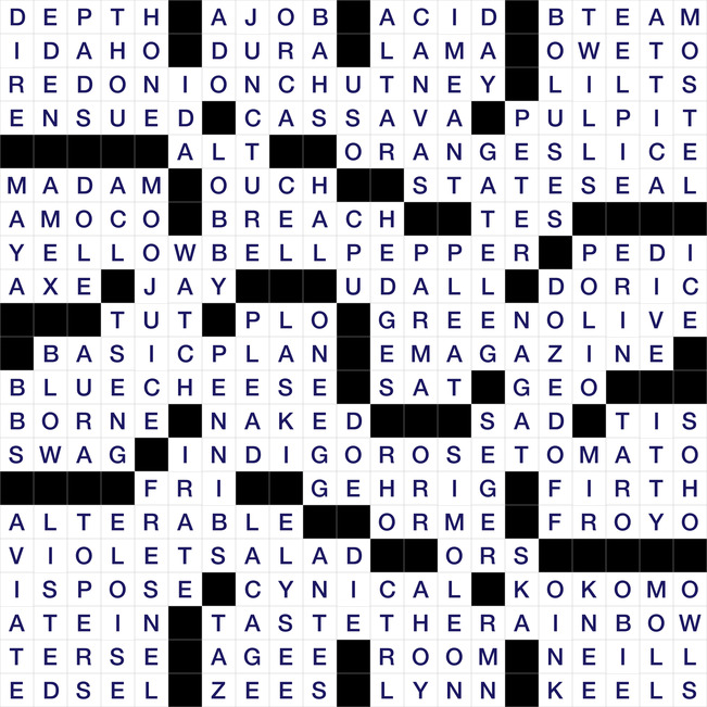 The Puzzle Grid for Today is 21 boxes wide and 21 boxes tall. It’s name is Palette-able. The todays puzzle is classified as an American type of puzzle and was created by Derek Ruttan & Edited by Mike Shenk. It has a total of 62 Horizontal Clues and 78 Vertical clues, which need to be solved to completely solve the puzzle.