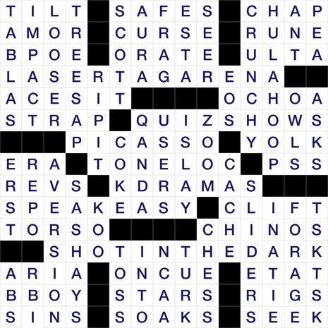 The Puzzle Grid for Today is 15 boxes wide and 15 boxes tall. It’s name is Guessing Game. The todays puzzle is classified as an American type of puzzle and was created By Andrew Mascillaro & Edited by Mike Shenk. It has a total of 35 Horizontal Clues and 39 Vertical clues, which need to be solved to completely solve the puzzle.